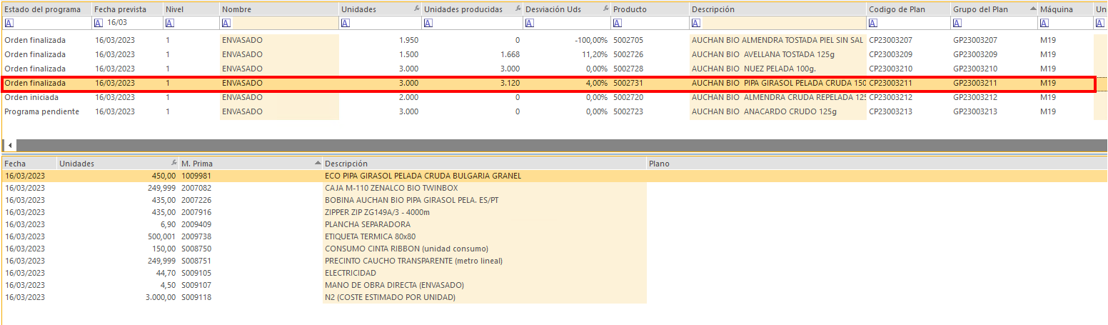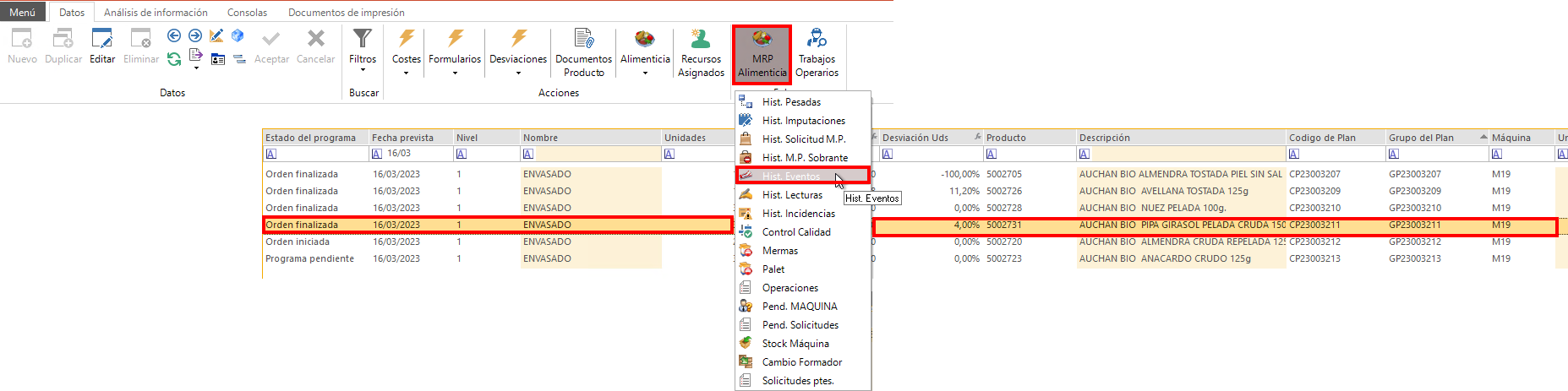 - Le damos a "MRP-alimenticia" > "Hist. Eventos".