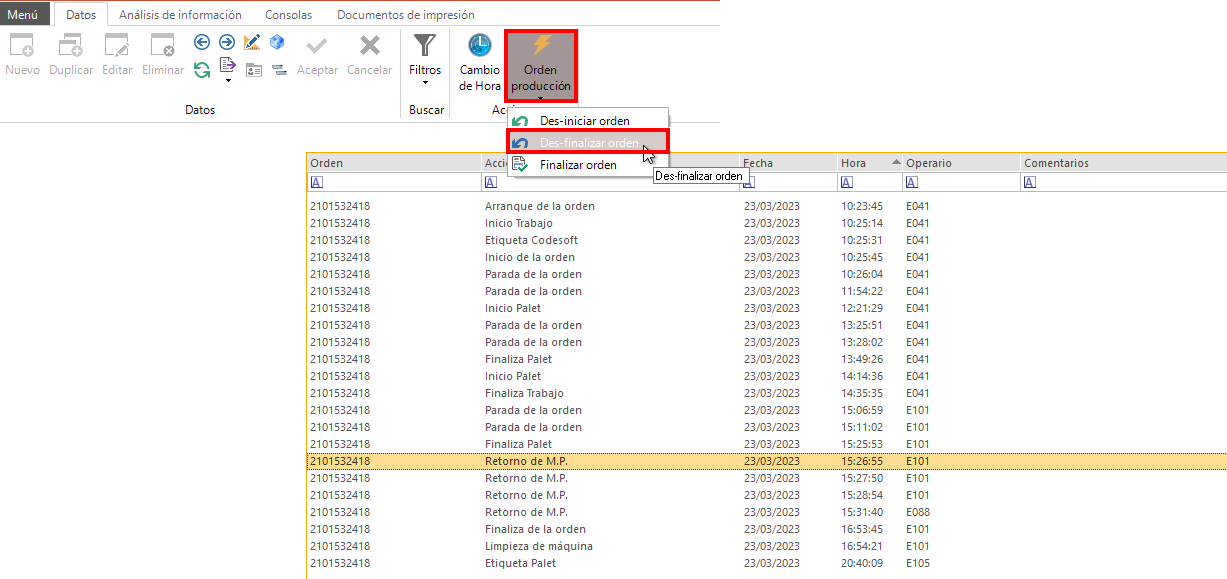 - En esta pantalla vemos todos los eventos y podemos Des-iniciar, Des-finalizar o finalizar (previamente des-finalizada) una OF: